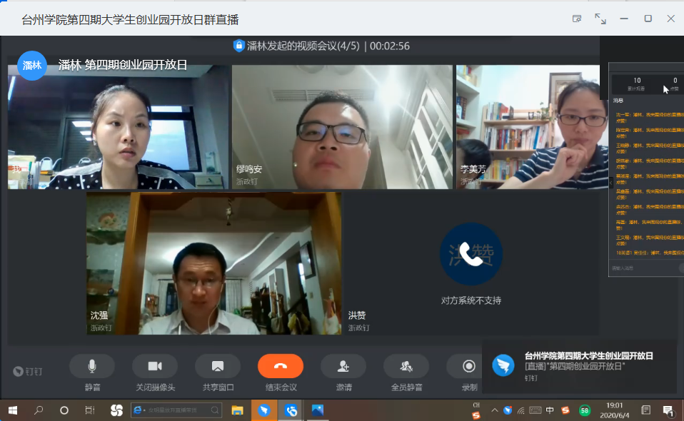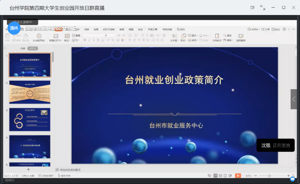 活动由创业学院副院长缪鸣安主持,并邀请台州市人力资源和社会保障局人才开发和市场处负责人洪赞、台州市人力资源和社会保障局就业服务中心副主任沈强、台州学院商学院副教授李美芳及创业学院双创实践负责人潘林,分别针对教师在岗创业、毕业生创就业及师生创业等,进行了台州市人才新政、毕业生留台创就业扶持政策、公司注册运营、大学生创业园入驻等政策办法的宣讲和答疑,通过线上交流为大学生提供相关的咨询服务,解答师生在创就业过程中遇到的问题和困惑。创业师生们也在线上积极主动地与各位专家老师进行深入的交流和互动,提出自己的问题和想法,活动氛围热烈。