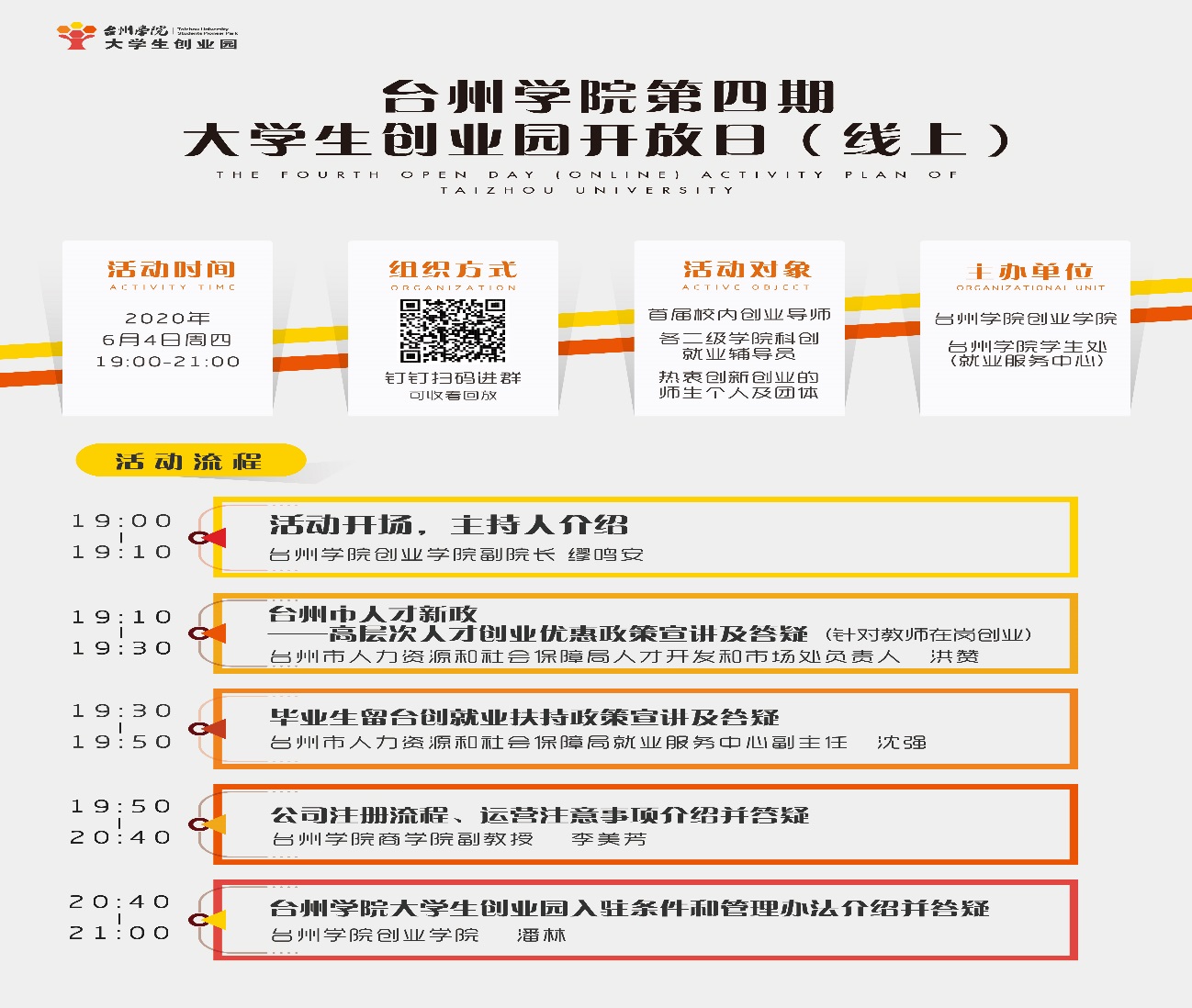 为更好地帮助热衷创新创业的师生个人及团体深入了解创就业扶持政策,解决创业过程中遇到的实际困难,为师生创新创业工作做好服务打好基石,6月4日晚,创业学院、学生处(就业服务中心)联合主办台州学院第四期大学生创业园开放日线上服务活动。