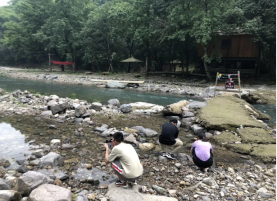 第二天的清早,趁着水面的雾气还未消散,我们从竹家山村入口出发,一路向东,对于竹家山村、柴坦水库、情人谷三个区块之间的连接进行了更深的探索。途经柴坦水库,抵达情人谷,山野的风裹挟着清爽的水汽扑面而来,我们沿小径向下深入野炊之地,在鹅卵石堆积起来的浅滩上找寻设计灵感。原路向西时,我们模拟游客旅游情景,计时返回。