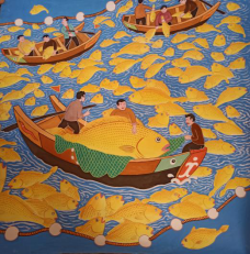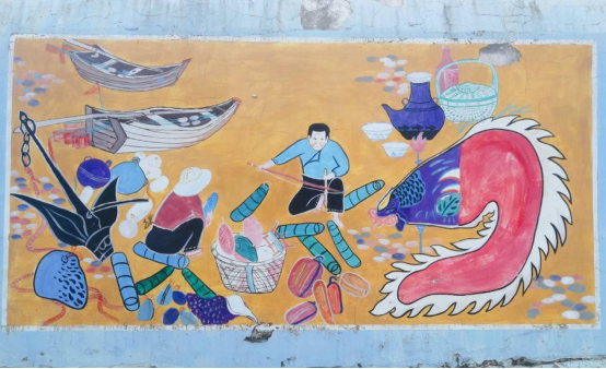 随后,我们参观了玉环民间艺术家李顶才的工作室。李师傅是渔家子弟出身,经过多年的探索,自学渔民画,积累了丰富的创作经验。如今,他已创作完成东沙渔村的系列渔民壁画,在玉环境内具有一定的知名度。工作室里陈列着李师傅各时期创作的作品,大多反映当地渔业生产、渔民生活等题材。作画形式多样,包括油画、版画、丙烯画等,以鲜艳的色彩和质朴的构图来表现渔民征服大海的决心和丰收时的喜悦。近年来,随着玉环海岛旅游业的蓬勃发展,当地巧妙地将渔民画融入海景村落、石屋墙壁之中,使渔民画成为玉环旅游业的一张名片。