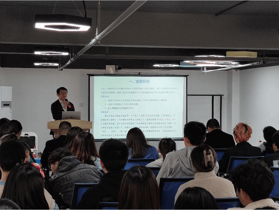 在1号教学楼1楼就业“职”播间,台州市人力资源与社会保障局就业服务中心副主任沈强为创业团队作《台州高校毕业生就业创业政策解读》。台州市创业服务协会、台州市科技孵化协会、椒江区市场监管局和泰隆银行分别为大学生作投融资等创业实务、公司注册和知识产权等法务、创业优惠贷款咨询,现场反响热烈。