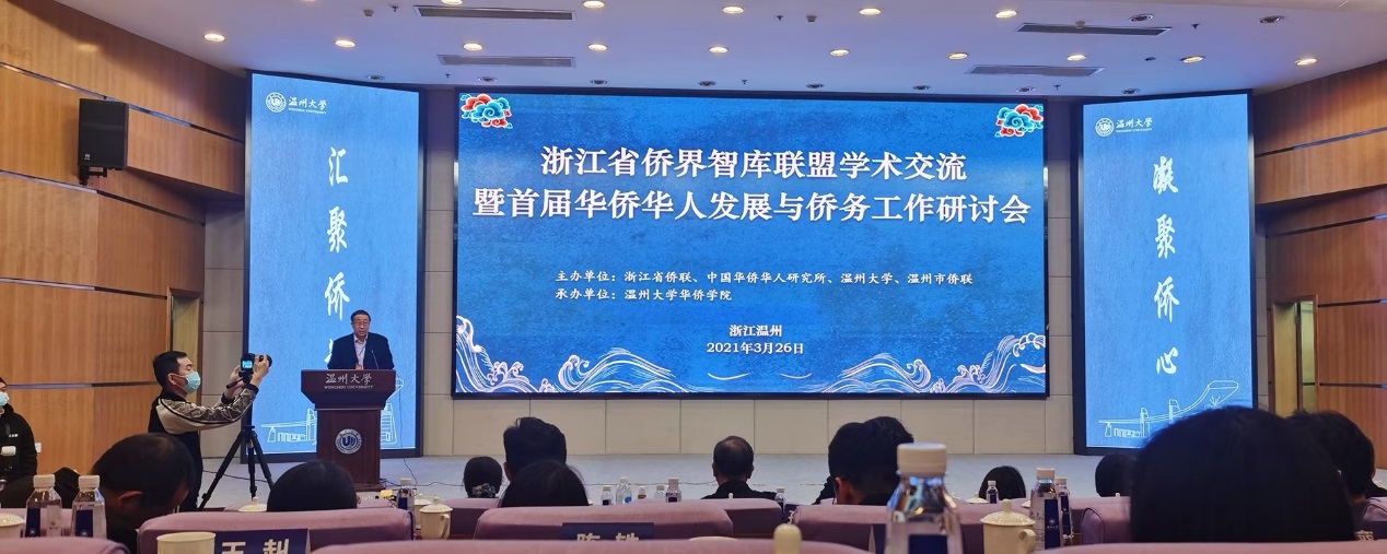 3月26日下午,浙江省侨界智库联盟学术交流暨首届华侨华人发展与侨务工作研讨会在温州大学育英图书馆召开。本次研讨会由浙江省侨联、中国华侨华人研究所、温州大学、温州市侨联主办,温州大学华侨学院承办。浙江省侨联党组成员、副主席兼秘书长周松一,中国侨联常委、温州大学党委书记谢树华,省侨联兼职副主席、浙江清华长三角研究院华侨华人发展研究中心主任白宁出席活动,省侨联兼职副主席、温州市侨联党组书记、主席郑宏国主持。我校侨留联秘书长创业学院副院长缪鸣安代表学校出席。