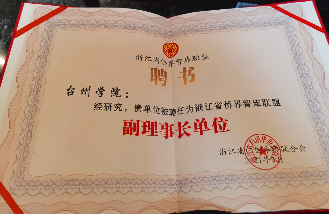 在本次活动中,我校被授予“浙江省侨界智库联盟副理事长单位”,这是对我校侨留联工作的支持与肯定。自2019年4月学校成立侨留联以来,在省侨联和校党委的领导下,协会举办了多期“海外英才大讲堂”,承办了省侨联“海燕行动之发现台州”,并与台州欧美同学会、椒江留联会、临海留联会等兄弟单位共同开展“育英公益”、“牛剑聚台州”等联谊交流活动,各位会员在学校的人才培养、科技创新、社会服务等方面作出了重大贡献,成为学校改革、发展、稳定的重要力量,成为支撑学校深化实施“申硕、升格、创一流”发展战略,打造高水平应用型大学的宝贵人才资源。