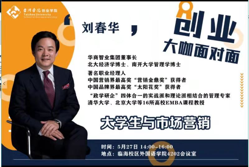 5月27日下午,第十期“创业大咖面对面”活动在临海校区外国语学院会议室顺利举行。中国著名职业经理人,“政学研企”四体合一的实战派和理论派相结合的管理专家、华商智业集团董事长、北大经济学博士、南开大学管理学博士刘春华应邀担任主讲嘉宾。创业学院院长周瑶出席,并为刘春华博士颁发了台州学院校外创业导师聘书。