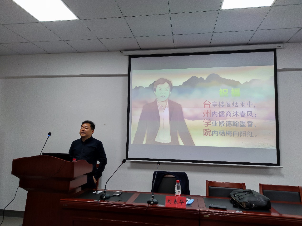 最后,刘春华博士为我校创作的“台亭楼阁烟雨中、州内儒商沐春风、学业修德瀚墨香、院内杨梅向阳红”的《台州学院》藏头诗赢得了参会全体师生的阵阵掌声和喝彩。