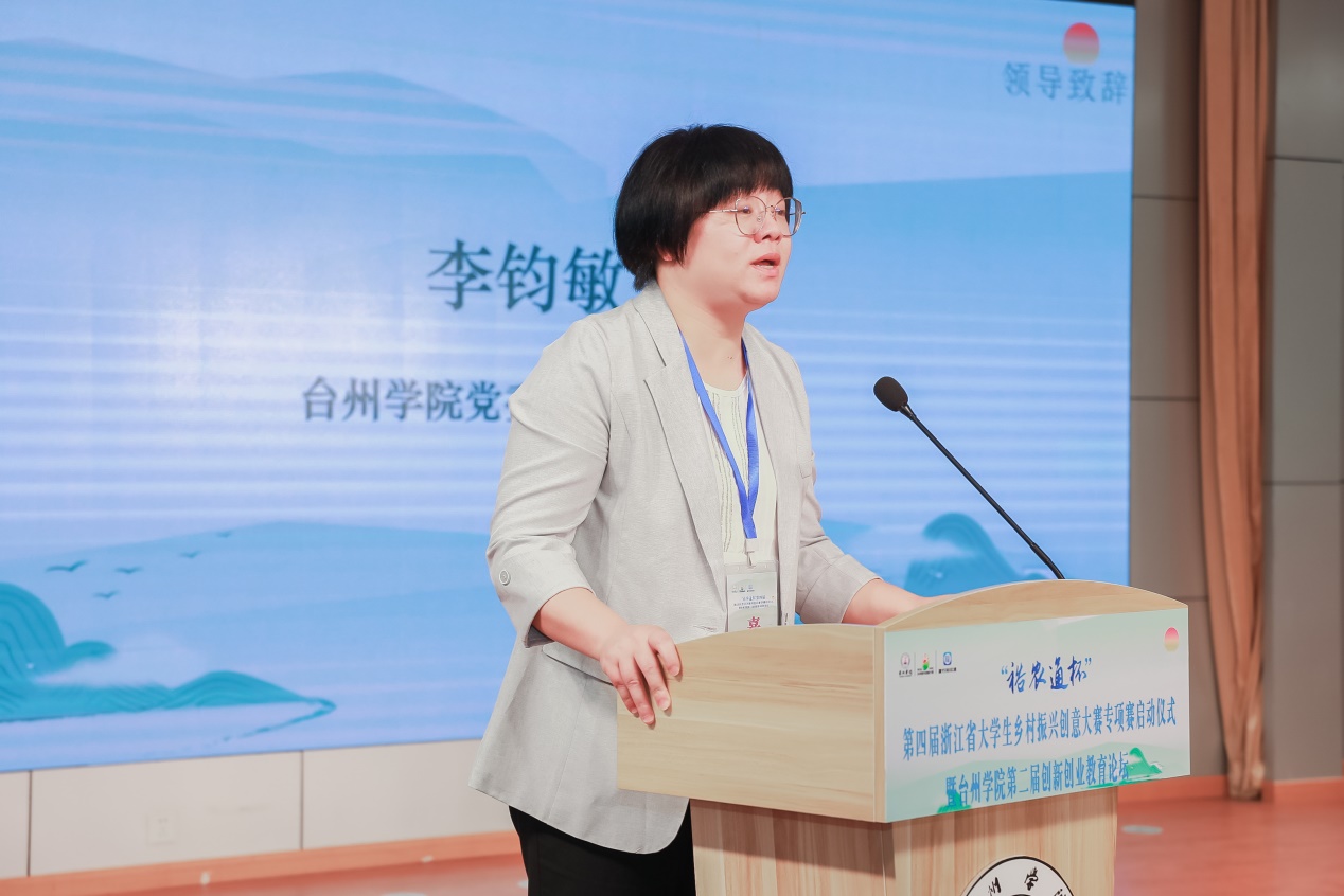 台州学院党委委员、副校长李钧敏对参加活动的领导、嘉宾及师生代表表示欢迎。李钧敏指出:台州学院一直致力于以双创为抓手,推动校地共融,实现校地共生。台州学院作为应用型地方高校,释放高校力量参与乡村振兴,不仅是社会发展的现实需求,更是教育服务社会、服务地方经济的实现途径。学校将一直秉持“育德树人”的初心,发挥高校双创元素,根植地方沃土,助力乡村振兴。