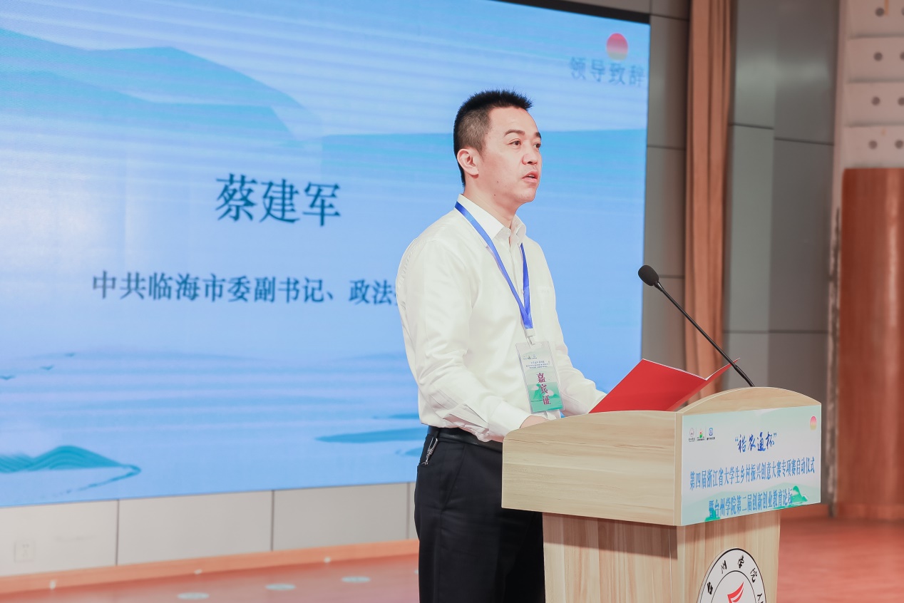 中共临海市委副书记、政法委书记蔡建军发表讲话。蔡建军指出,临海作为浙江省大学生乡村振兴创意大赛专项赛的首发地,经过两届的举办,该赛事已成为临海重要的文化品牌。希望在今年的赛事中借助高校和大学生的智慧,充分挖掘临海农业发展新潜力,进一步推动数字技术与临海农业产业深度融合发展,为临海乡村振兴再添鲜活案例。
