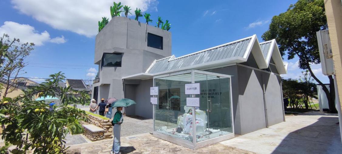 自北向南迈进,垃圾分类示范房也缓缓呈现了全貌——辅以小范围配套的垃圾分类主题景观,三层高灰色建筑上添加了仿真绿植。示范房内主要以体验、参观、学习为主,在为我们展现了路桥区垃圾分类大事记等的同时,更是为居民提供了垃圾分类方面的认知与体验。