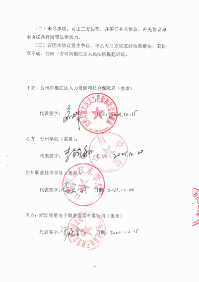 共建校外创业实践平台。积极推进与市人社局、温岭市、玉环市等政府部门合作共建大学生创业中心。大力推进与星星电子商务、台州职业技术学院合作共建“台州高校创业园”。