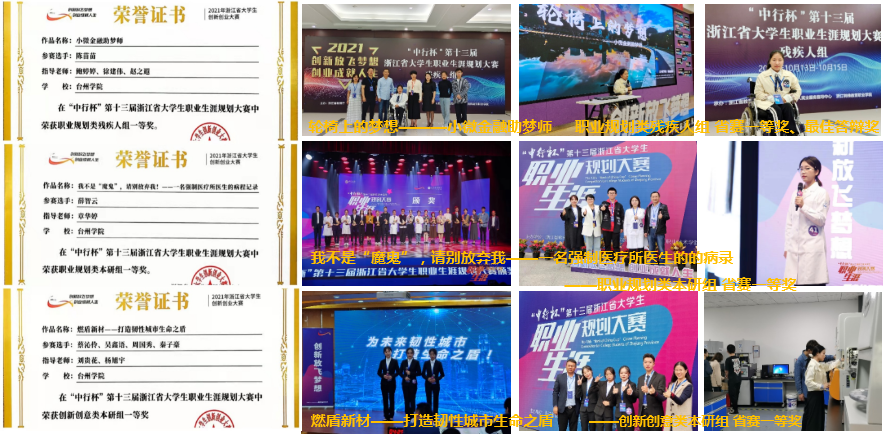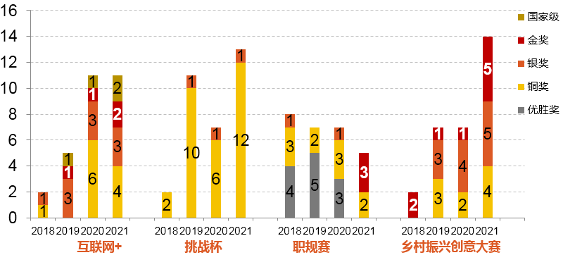 2021年,“互联网+”大赛获国铜2项、省赛2金3银4铜,获评“青年红色筑梦之旅”优秀组织奖,实现 “互联网+”大赛主赛道金奖上零的突破,获奖数量为历年之最。在 “挑战杯”大学生课外学术科技作品竞赛中,创业学院与团委合作,获得1个二等奖、12个三等奖。在浙江省职规大赛中,创业学院与学工部协同发力,在职规赛三个赛道分获一等奖,还荣获大赛最佳组织奖、最佳答辩奖,取得我校历年最好成绩,是全省唯一一所取得大满贯高校。在浙江省乡村振兴大赛中,我校获得5金5银4铜,取得了历史性突破!我校也被评为该赛事的优秀组织单位。