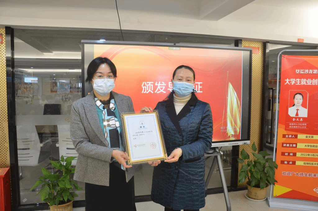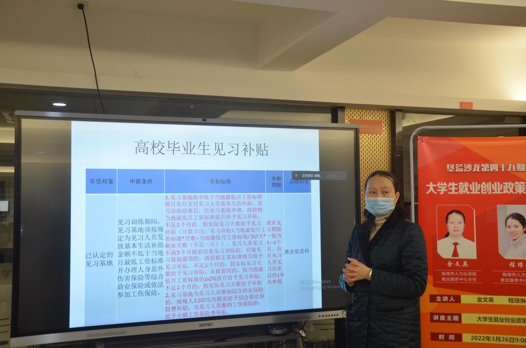首先,金文英就临海市大学生创业就业政策向同学们解读。从就业政策、职业技能培训补贴、创业政策向同学们作了详细介绍。会后,临海市人社局、临海市场监管局、农商银行代表与创业园团队同学就就业创业政策、企业注册、大学生创业贷款等内容展开详细交流,嘉宾为其答疑解惑。