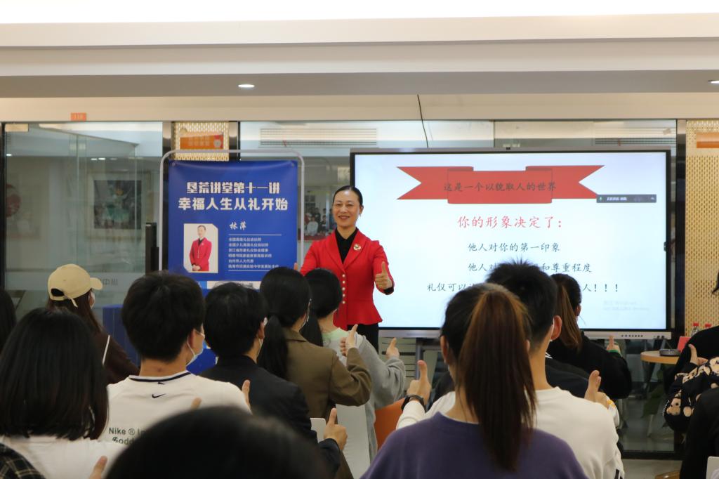 活动过程中,林萍与在座创业团队成员探讨了“礼仪”的定义,讲授了关于握手礼的相关礼仪,示范了符合“礼”的仪态动作,通过分享亲身经历使同学们认识到礼仪的重要性,并与在座大学生进行了积极的交流。