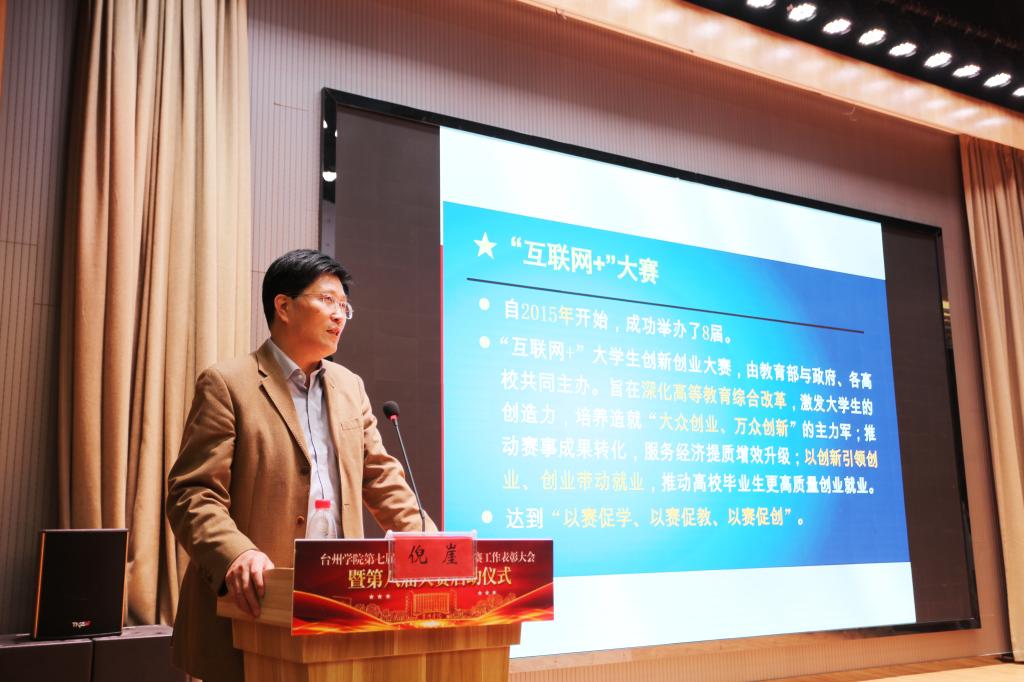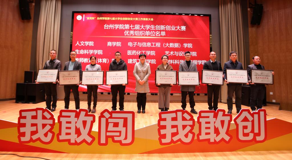 3月14日晚,我校第七届大学生创新创业大赛工作表彰大会暨第八届大赛启动仪式在椒江校区大学生活动中心举行。台州学院党委委员、副校长李钧敏出席大会并讲话,创业学院院长周瑶主持,校双创指导委员会委员、竞赛获奖团队师生、学校创业师生代表及资深赛事专家近400人参加此次活动。