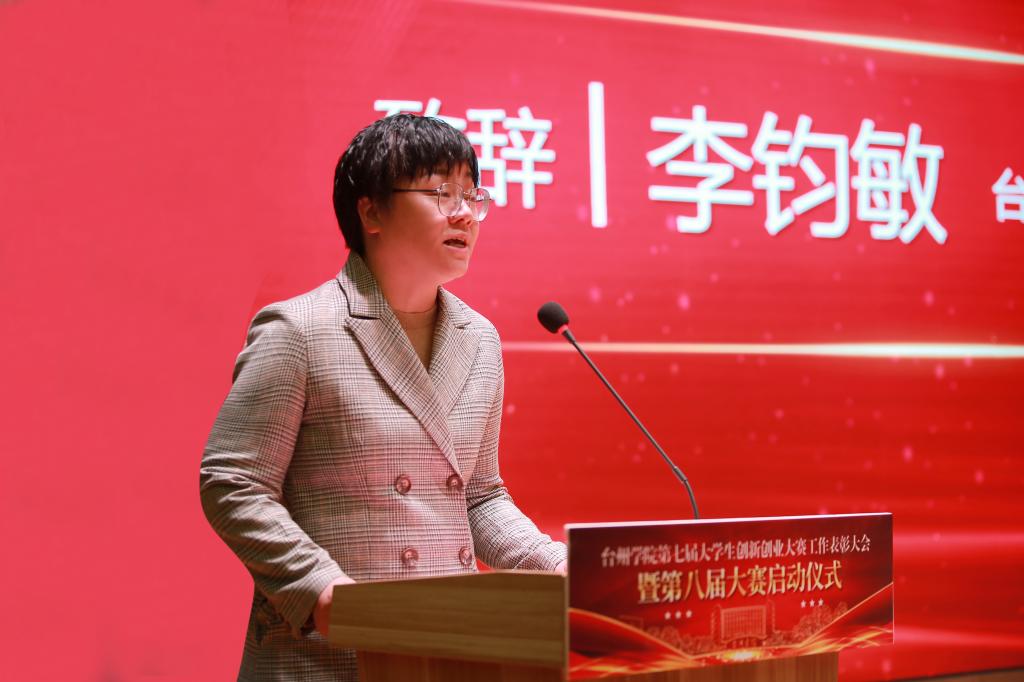 李钧敏对我校2022年双创竞赛成果表示肯定。2022年,我校学科竞赛获国家级奖项179项、省级奖项1008项,国赛奖项含金量明显提升;以“互联网+”为代表的双创类赛事关注度、参与度空前高涨,累计有1861个项目,10699人次参加,获得省级及以上奖项32项,其中,国家级银奖1项、铜奖2项,省级金奖(一等奖)6项、银奖(二等奖)8项、铜奖(三等奖)16项,生动诠释了台院青年不畏艰辛的激昂风采。她指出,以“互联网+”大赛为代表的双创赛事,是学校人才培养、科学研究、学校实力的重要展示“窗口”,更承担着深化创新创业教育改革、提升应用型人才培养质量的重要作用,希望各职能部门和二级学院在后续工作中提高站位、深化认识、内培外引、深化改革,将双创赛事作为立德树人、提升应用型人才培养质量的重要抓手,持续推进双创教育工作水平提升。