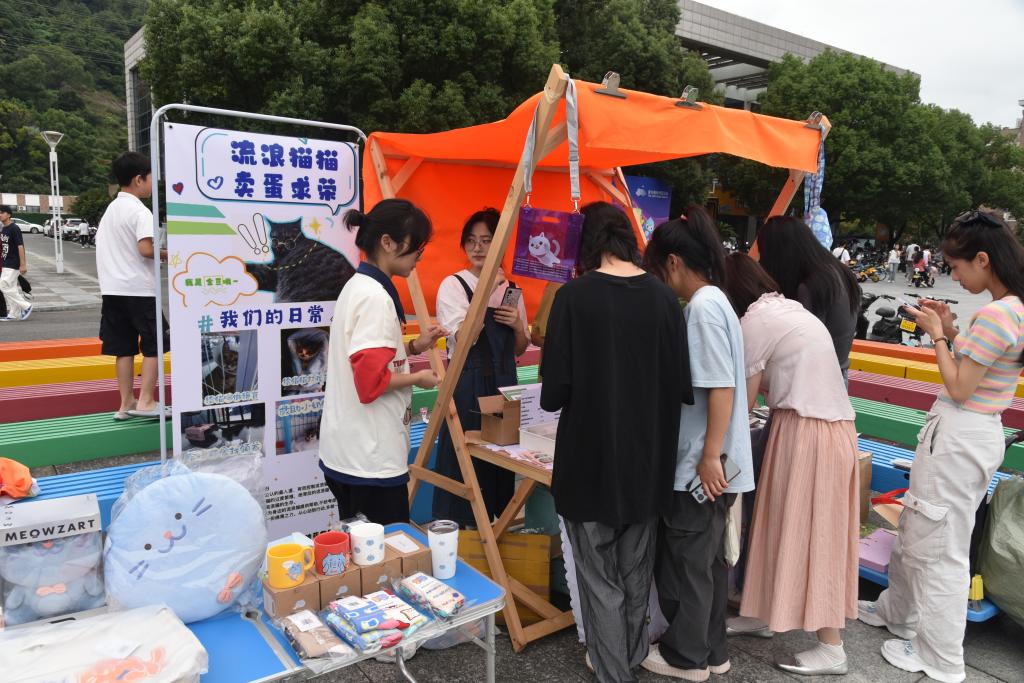 创业集市聚集了许多富有创意性的想法,摊主们展示了手工文创作品,充满未知乐趣的零食盲盒,无添加剂的文旦果汁等,吸引了众多师生和市民驻足。其中,有一家台院冷面校花杂货铺,倡导宠物责任养育,共建爱心学校,专卖猫猫相关文创产品,收益所得全部用于校园流浪猫绝育,疫苗,治病和日常投喂,期待人与猫猫和谐共生。临海校区更是体现了人文特色,集市期间载歌载舞各种特色表演,给集市带来大量顾客。最后,各个摊主在经营摊位的同时不断地积攒经验,体验着创业的过程。