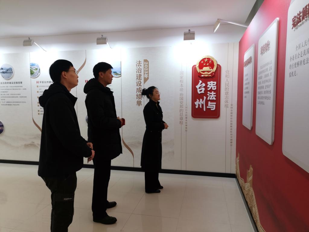 首先参观了台州市宪法宣传主题展。大家浏览了宪法历程、2023年台州法治建设成绩单,详细了解我国现行宪法的制定、修改过程和主要内容,深入学习了人民代表大会制度、公民的基本权利等知识。