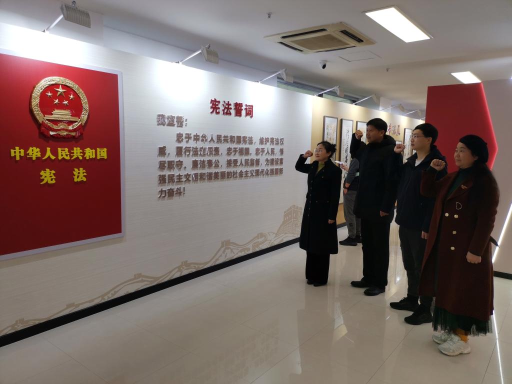 “我宣誓:忠于中华人民共和国宪法,维护宪法权威,履行法定职责,忠于祖国、忠于人民,恪尽职守、廉洁奉公,接受人民监督......”参观结束后,大家面向国徽站立,周瑶右手举拳,领诵誓词,带领大家宪法宣誓。