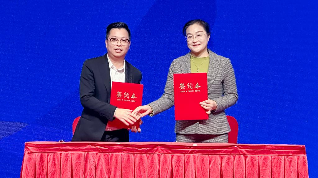 周瑶和椒江区青年企业家协会会长阮振华上台签署了“创青春”助力大学生创业创新项目。