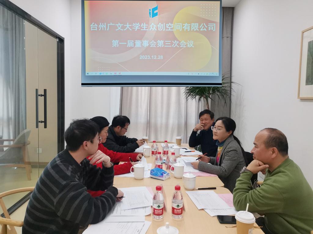 12月28日下午,台州广文大学生众创空间有限公司召开第一届董事会第三次会议。董事长周瑶、董事会成员蒋华江、胡蓉、林依洛出席会议,董事、总经理沈华胜主持会议。监事章豪列席会议,对会议过程做出监督并发表意见建议。