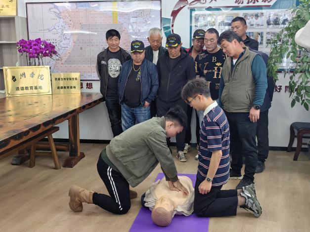校创业导师白石副教授带领创业团队成员现场向救援团队和渔民们演示心肺复苏,并细致讲解了操作要领和技术难点。