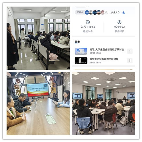 1月19日,学院举行课程建设专题研讨会明确改革方向,会议从内容重构、方法创新到落地落实形成闭环推进体系,持续推动创业教育提质升级,为培养新时代创新型创业者筑牢课程育人根基。3月1日,在创业学院副院长李银丹主持下,学院组织教学骨干开展线上沟通会,各章节主讲教师分享 PPT 及修改思路,聚焦教材修订内容进行深度打磨,会议同步明确多项教学创新要求,成为课程内容与教学方法创新的关键环节。为保障改革成果落地见效,3月8日,学院开展了课堂教学与备课研讨的双重推进工作。院长周瑶、副院长李银丹深入椒江、临海两校区进行课堂巡视,实地调研新学期课程教学开展情况,精准掌握教学落地实效。当晚,学院随即组织全体任课教师开展线上备课会,各教师对新修订的教学 PPT 进行全面分享交流,进一步打磨教学内容、统一教学思路,让课程改革的各项举措真正落到课堂教学实处。