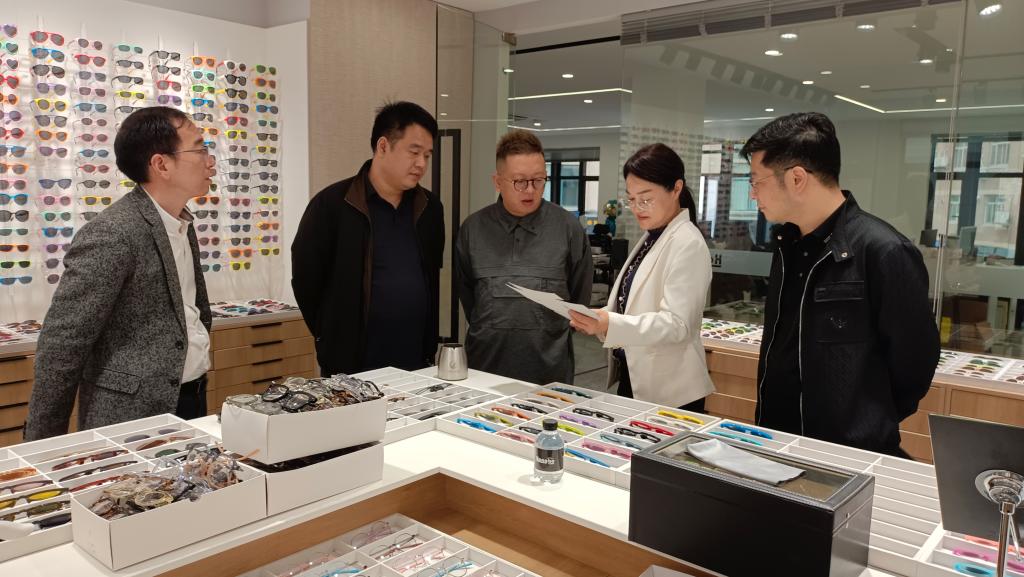 在临海市康波眼镜有限公司,负责人李林波向周瑶一行介绍了其公司产品特色、专利以及市场前景等。双方就台州学院大学生创新创业电商基地项目建设达成共识。