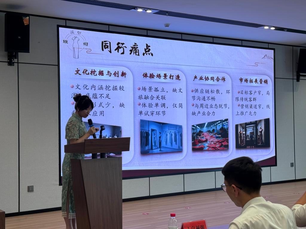 活动现场,另一项目“溪望旗袍”同样备受瞩目。该项目负责人张潇文来自临海校区的大学生创业中心,她介绍道,“溪望旗袍”以传统旗袍文化为根基,结合当地非遗工艺与溪望谷的地域特色,设计制作兼具古典韵味与现代审美的旗袍服饰。项目不仅推出旗袍成品展销,还计划开展旗袍制作体验工坊、主题走秀、文化研学等活动,让游客在溪谷间沉浸式感受传统文化魅力。